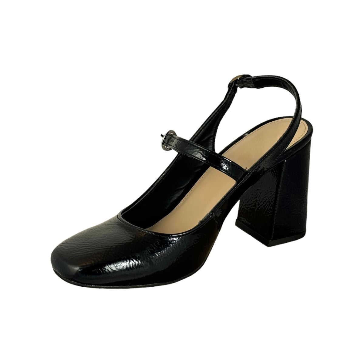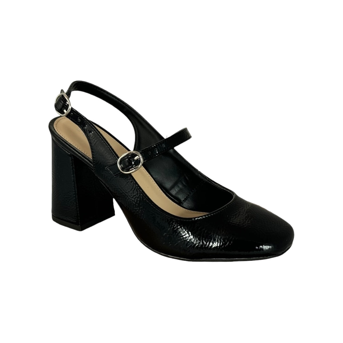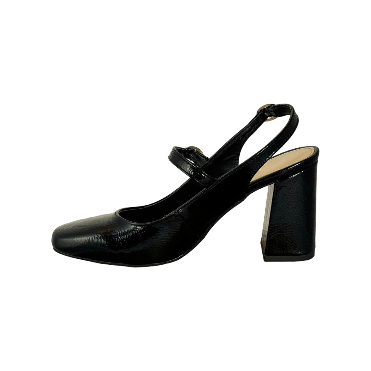 Ajustable con hebilla, con tacón de 8.5 cm. de altura.