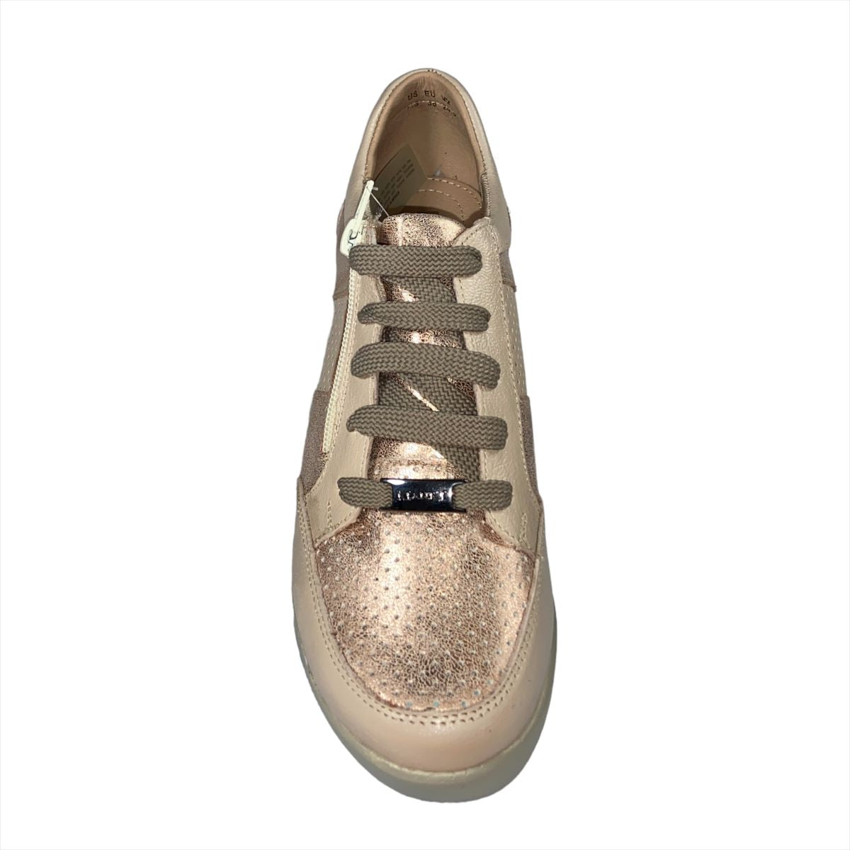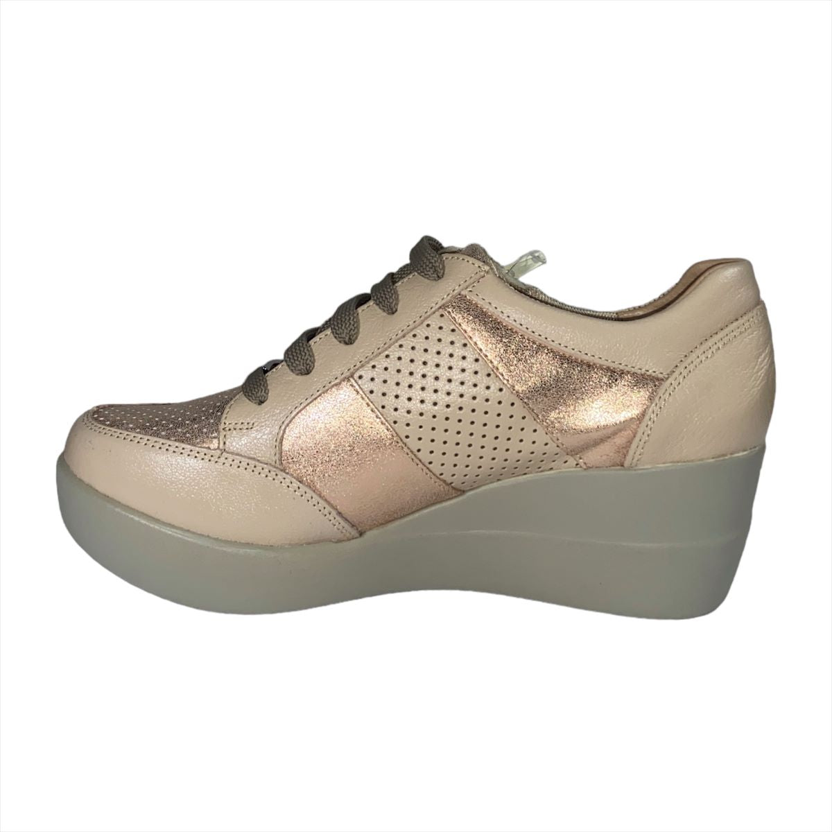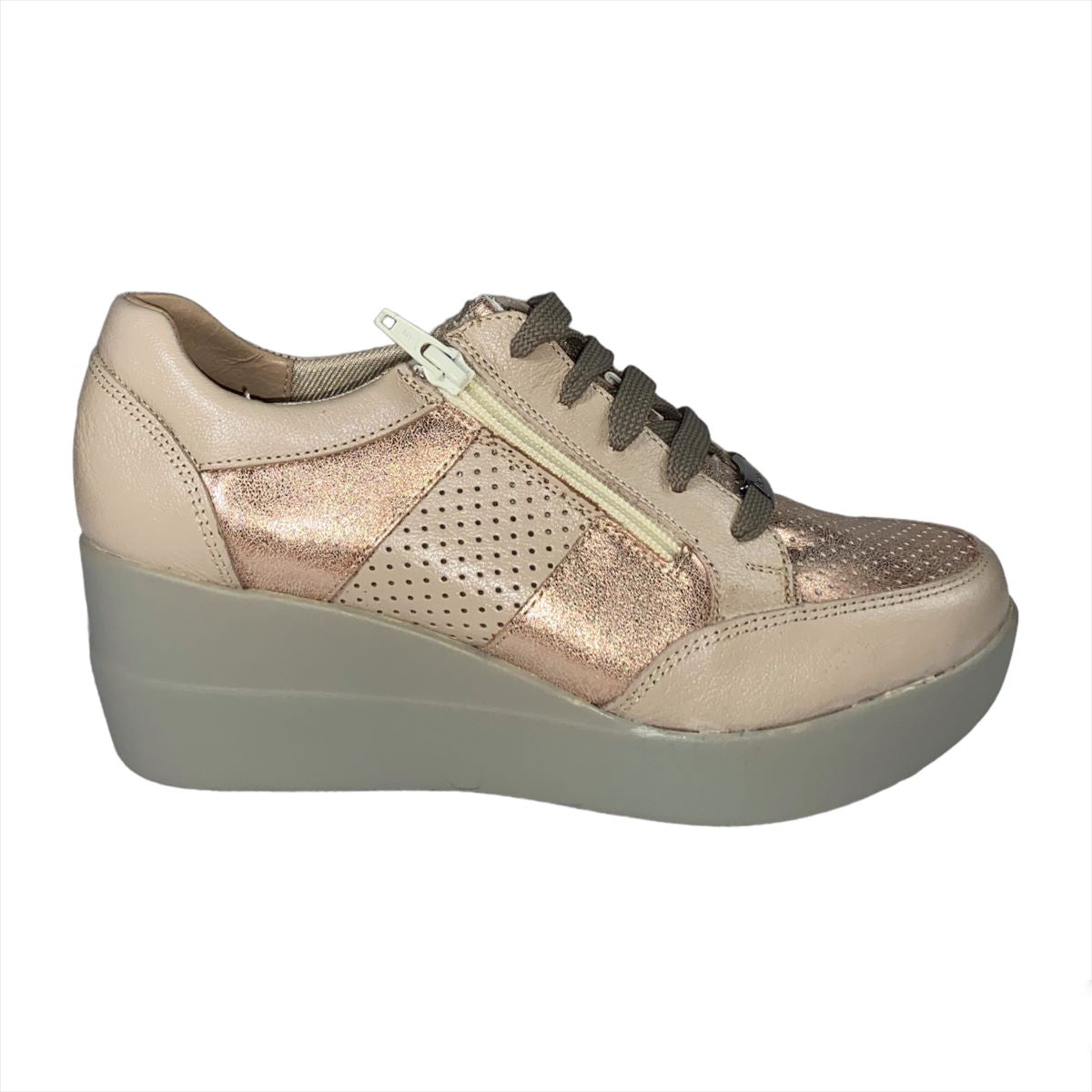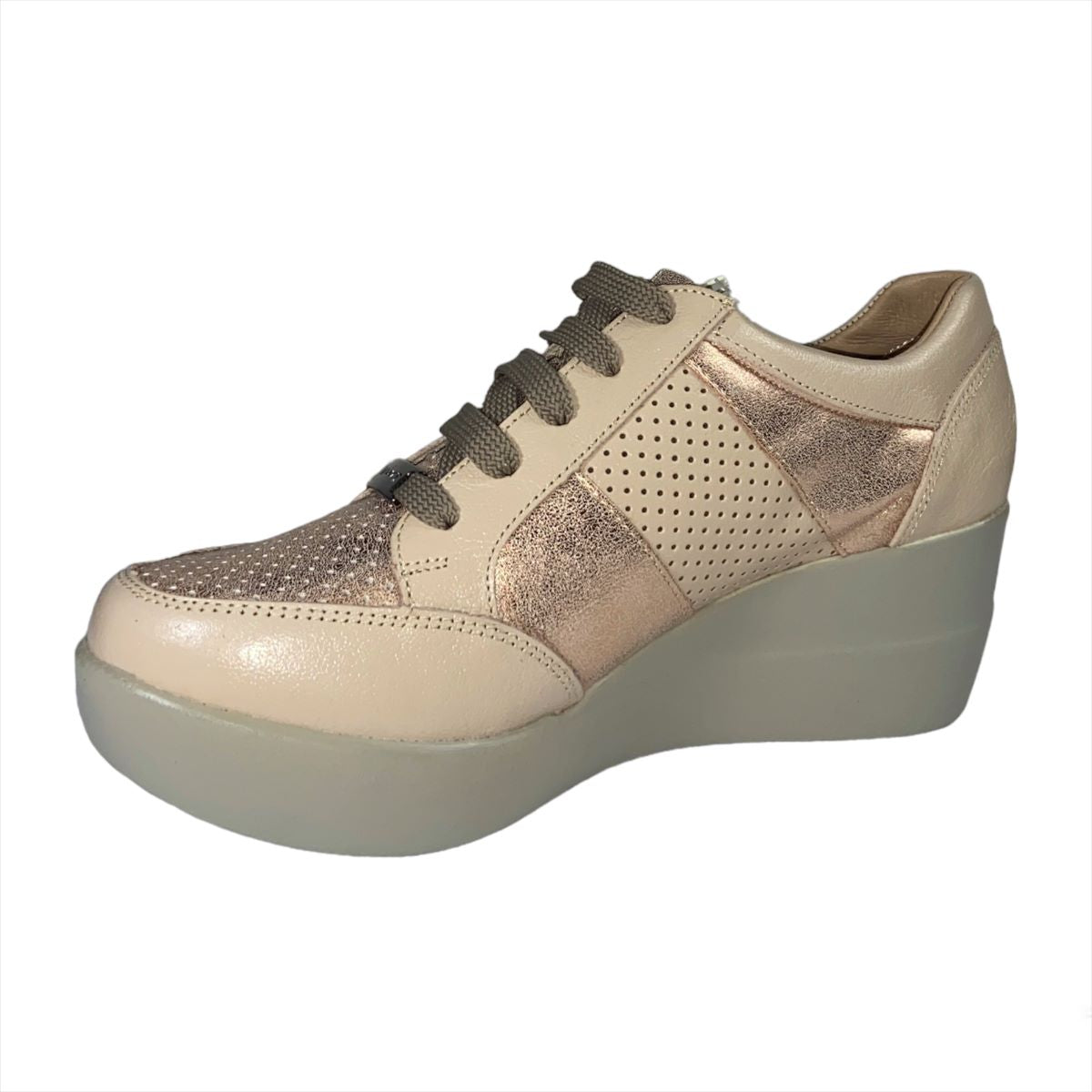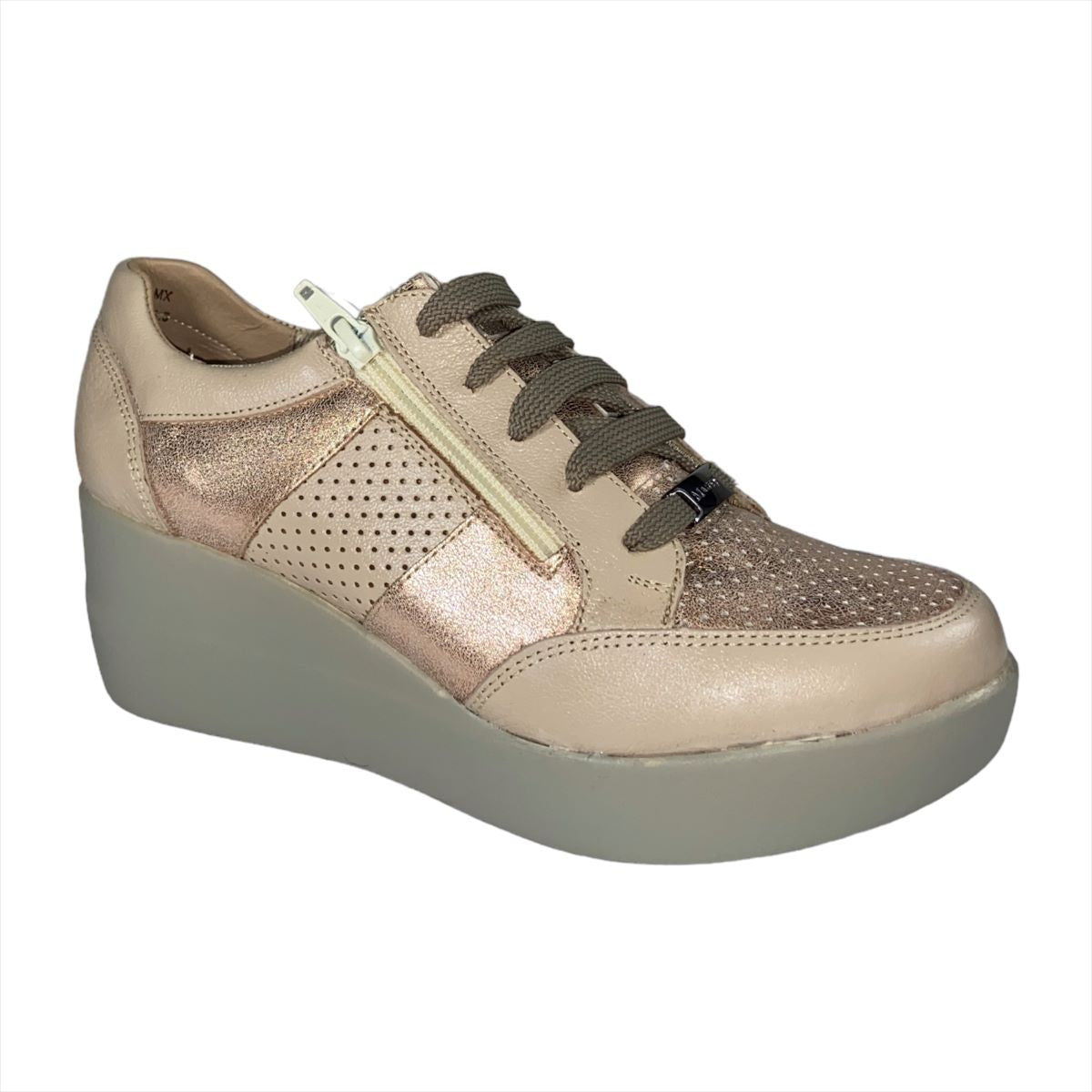 Ajustable con agujetas, con tacón de cuña de 6.5 cm. de altura.